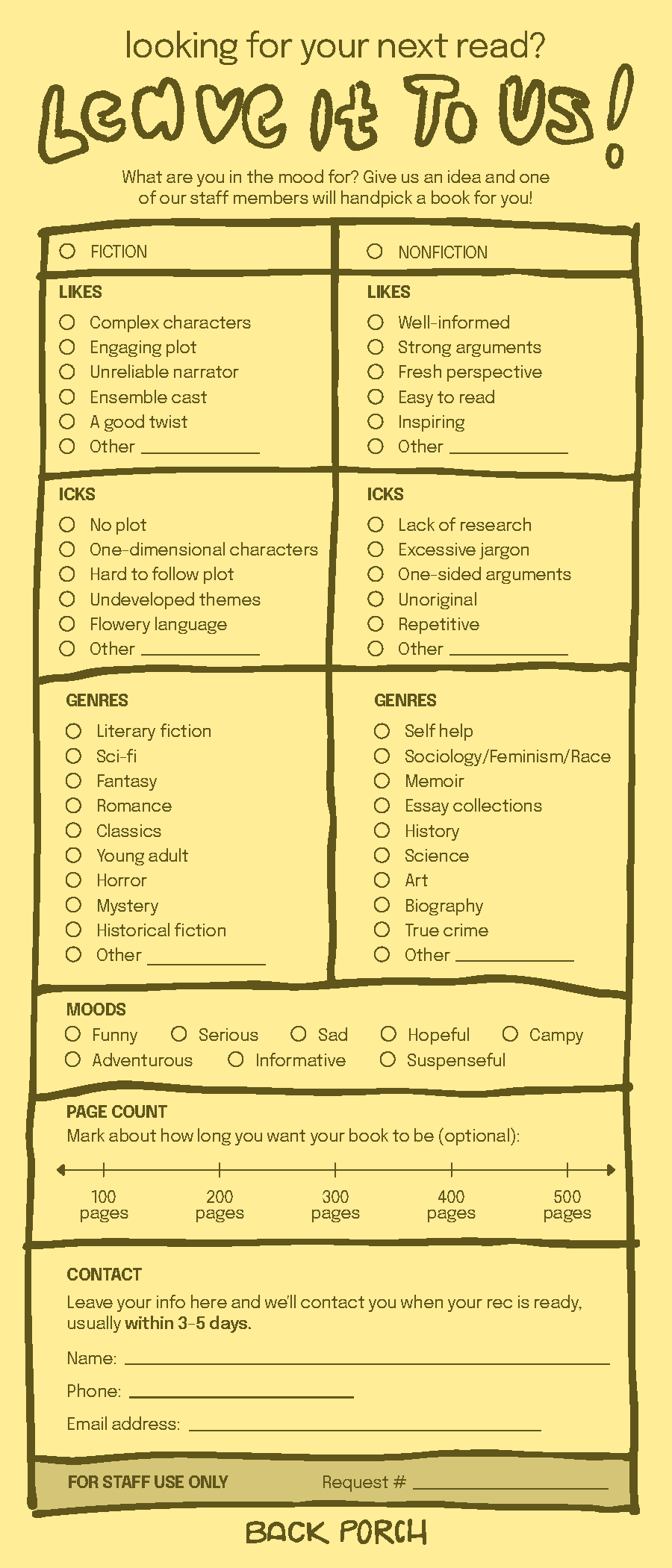 Stop by for a handpicked recommendation from one of our staf members, or join us for a monthly book club or zine-making workshop.